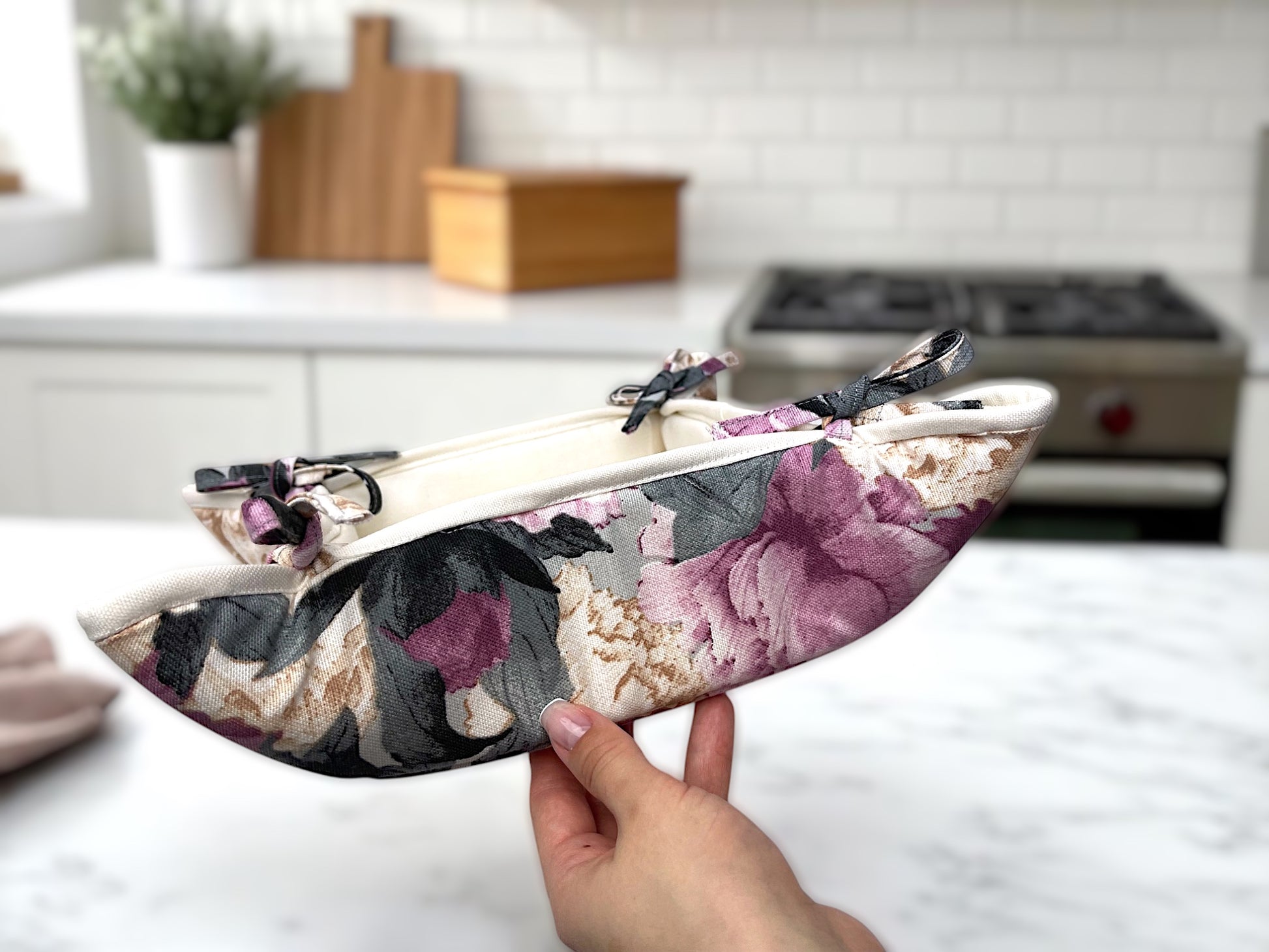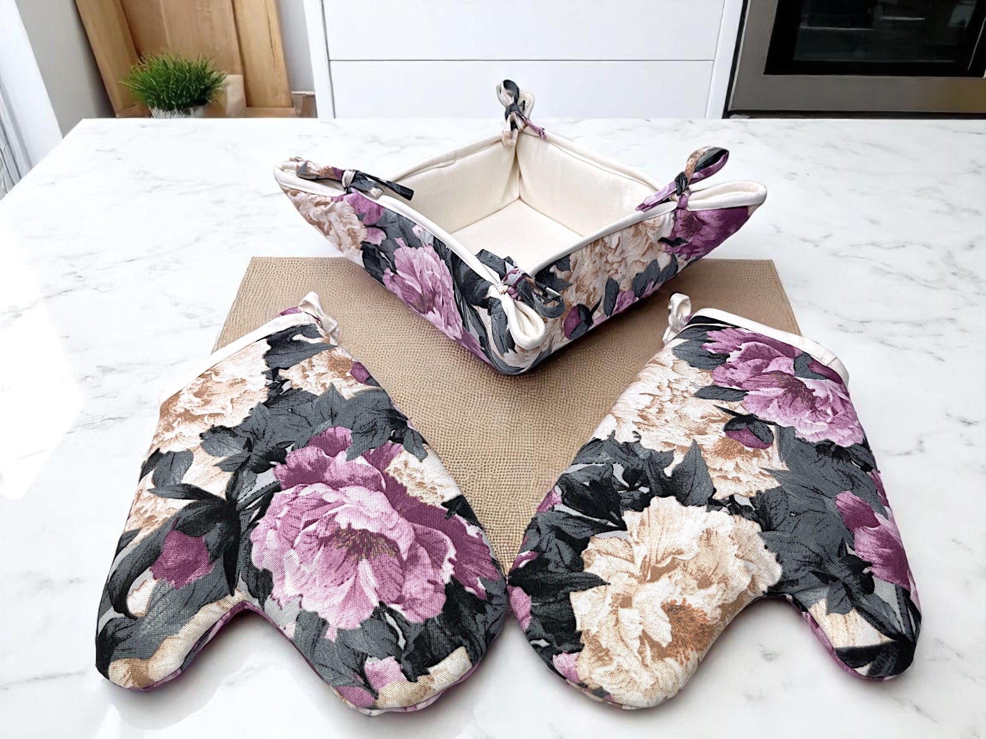 Kitchen sets: 2 Teflon oven mitts and a pastry basket with a Purple Peonies pattern