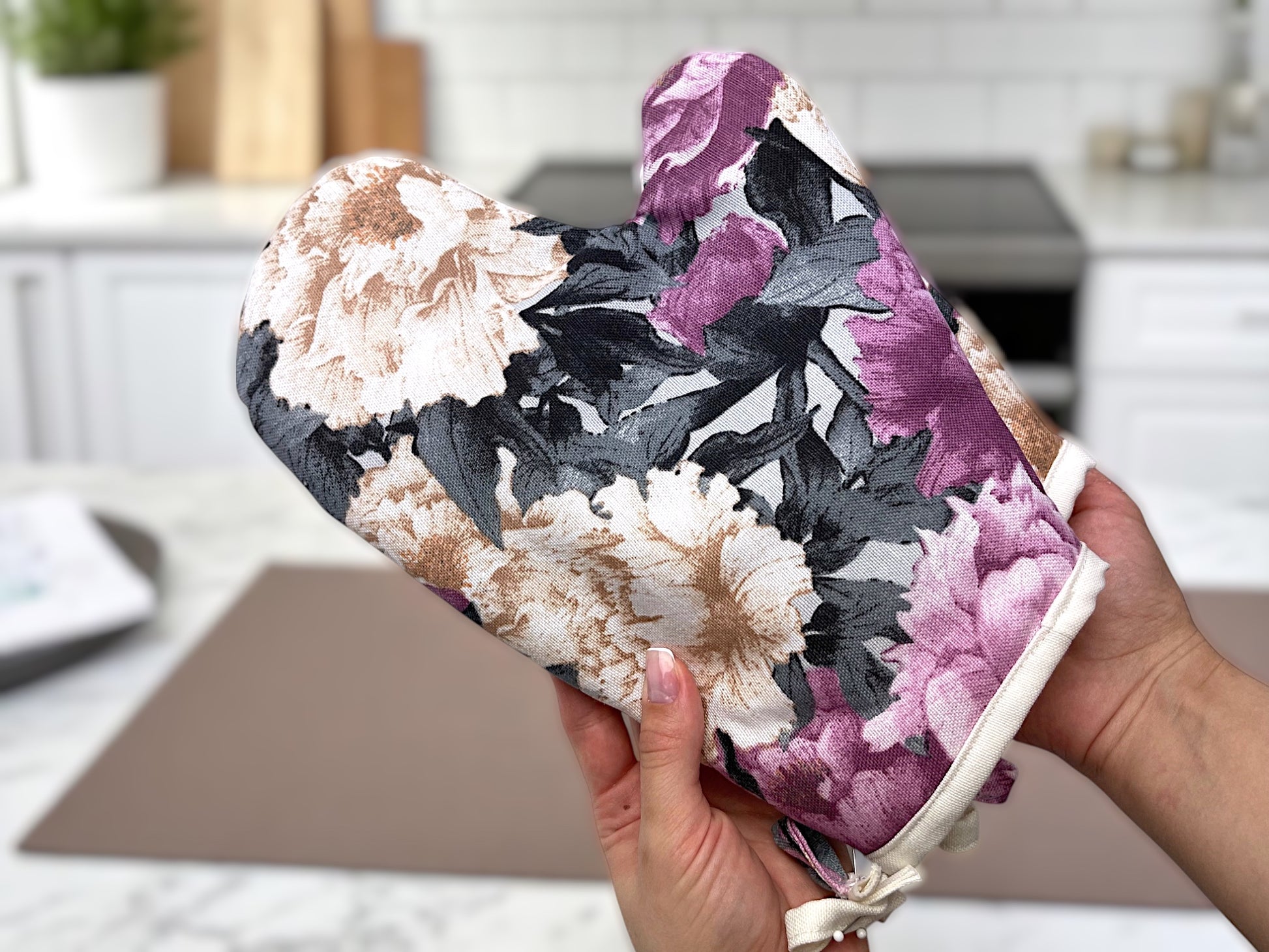 Stylish kitchen set - 2 Teflon oven mitts + pastry basket with Purple Peonies pattern