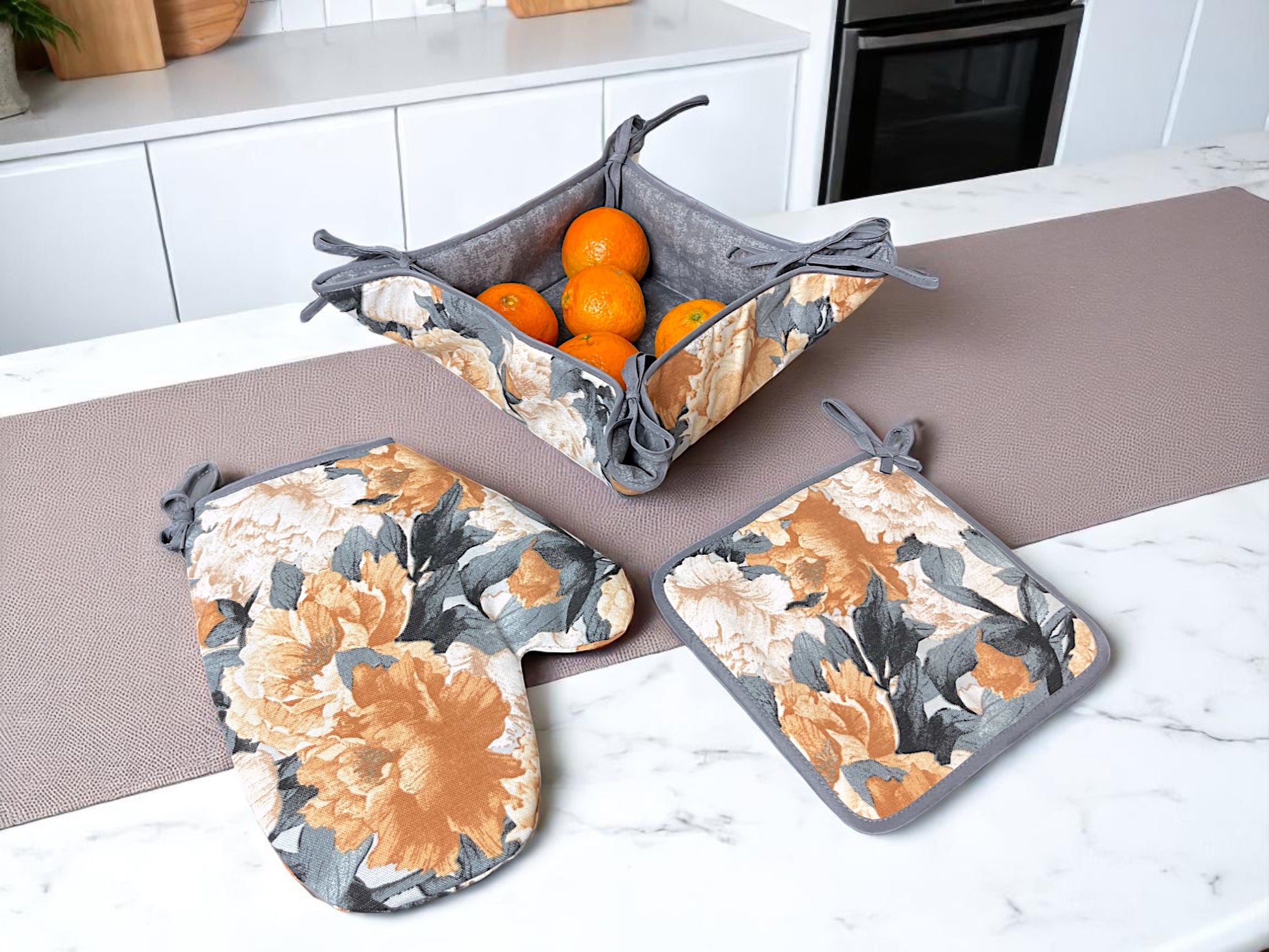 Kuchyňský sety: kuchyňská chňapka s teflonem, podložka a košík na pečivo se vzorem Zlaté pivoňky